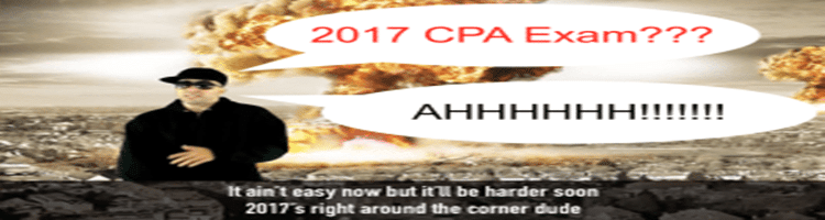 [ ATTENTION ]: 2017 CPA Exam Changes – PASS NOW (The End is Near) Posted by Another71 on Tuesday, January 19, 2016 INTRO: There’s something sad that’s about to happen…. Another71.com presents: The 2017 CPA Exam Changes CHORUS: It’s gonna change, yeah man it’s gonna change In 2017, it ain’t gonna be the same You better … Continue reading [Video] 2017 CPA Exam Changes (The End is Near)